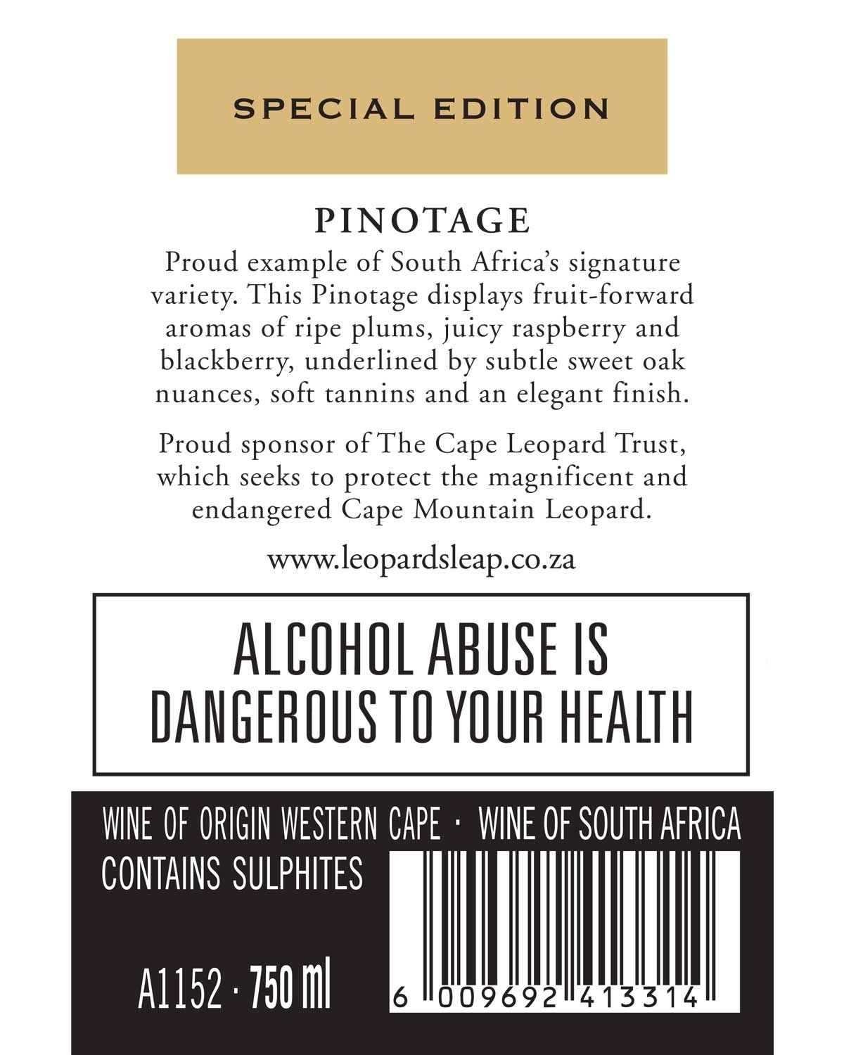 The wine matured for 14–16 months in a mix of French, American, and Hungarian oak barrels (5% new), enhancing fruit expression while adding subtle complexity. Released as a Special Edition, it proudly supports the Cape Leopard Trust in its mission to protect this magnificent and vulnerable species.
