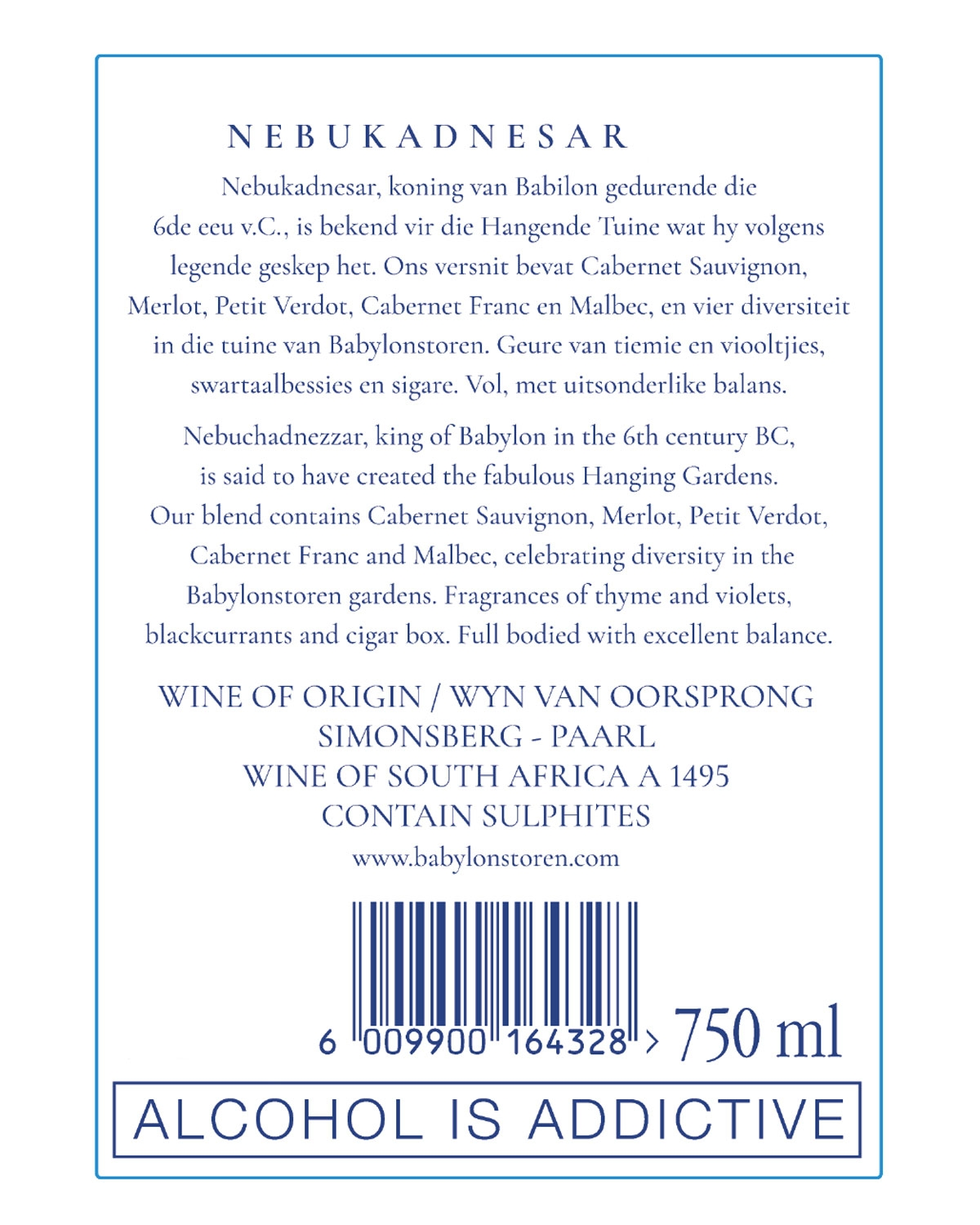 The Babylonstoren Nebukadnesar is a red wine made for pure enjoyment, offering a remarkable experience even on its own. However, it pairs exceptionally well with dishes such as roast beef, lamb with rosemary, or game meats. Its complex, fruit-forward character with delicate herbal notes makes it a perfect companion for wild game dishes and other hearty meat dishes.