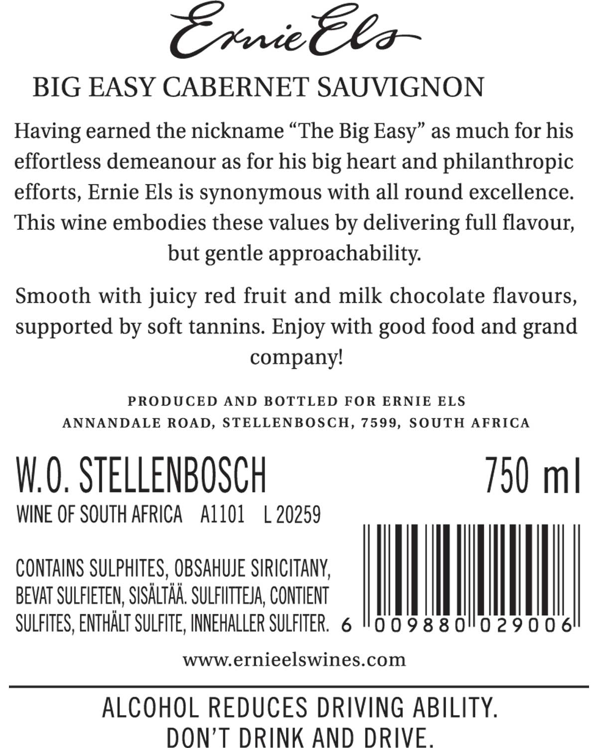 Der Rotwein reifte 14 Monate in französischer und amerikanischer Eiche und zeigt dadurch sowohl Tiefe als auch Balance. Er ist ein hervorragender Begleiter zu Pasta, Wildgerichten oder dunklem Fleisch, bietet aber auch solo puren Genuss. Seinen Namen verdankt der Wein dem leichten Golfschwung von Profigolfer Ernie Els, der auch als „The Big Easy“ bekannt ist.