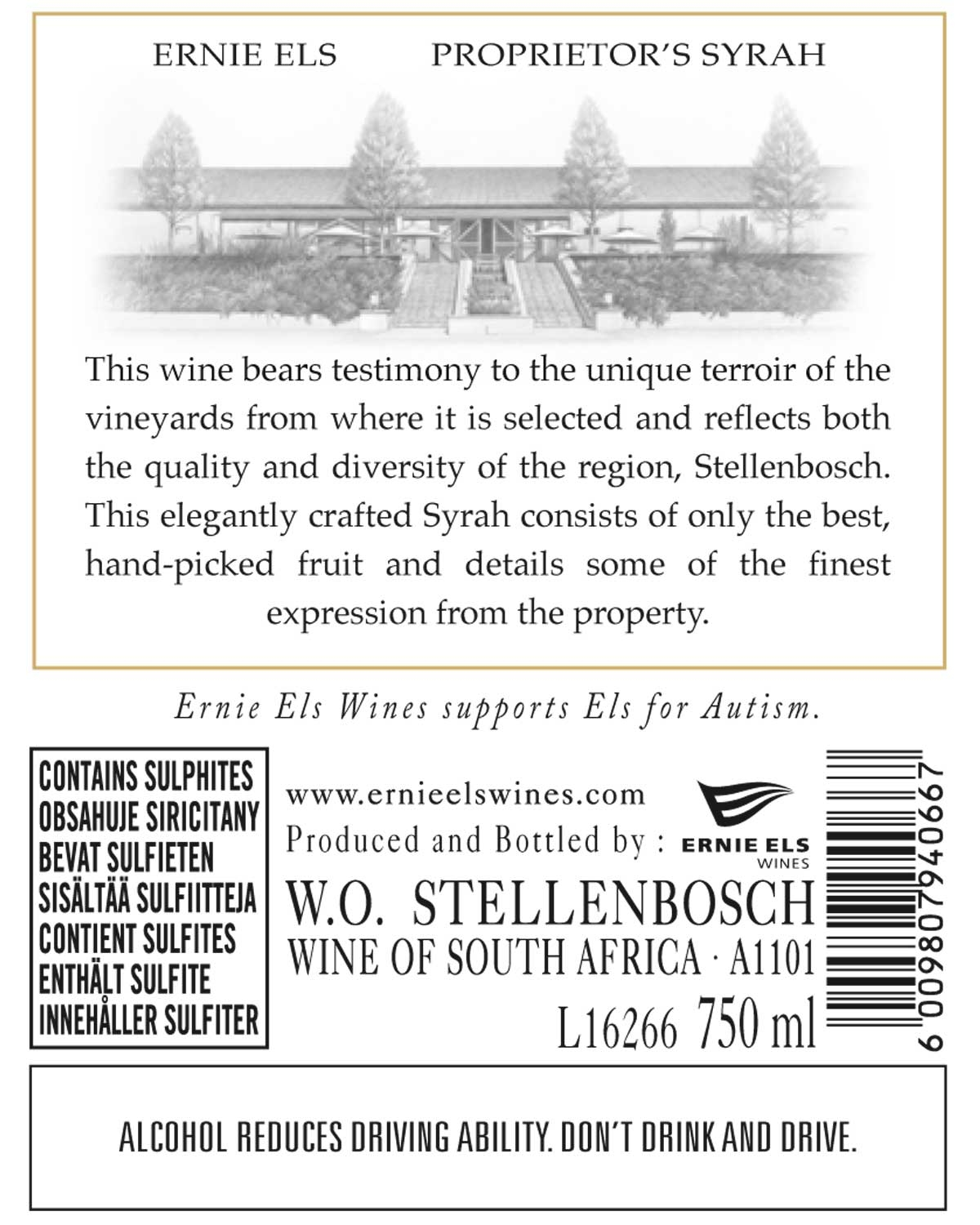 Samtene Tannine verwöhnen den Gaumen, während Aromen von Pflaume, Cassis und Kirsche in einem opulenten und würzigen Abgang ihren Höhepunkt finden. Der Ernie Els Proprietor's Syrah ist ein Wein von beeindruckender Komplexität, dabei lebendig und sehr luxuriös. Genießen Sie den Rotwein, der achtzehn Monate in französischer Eiche reifte, unbedingt einmal zu Wild, dunklem Fleisch oder Pikantem.