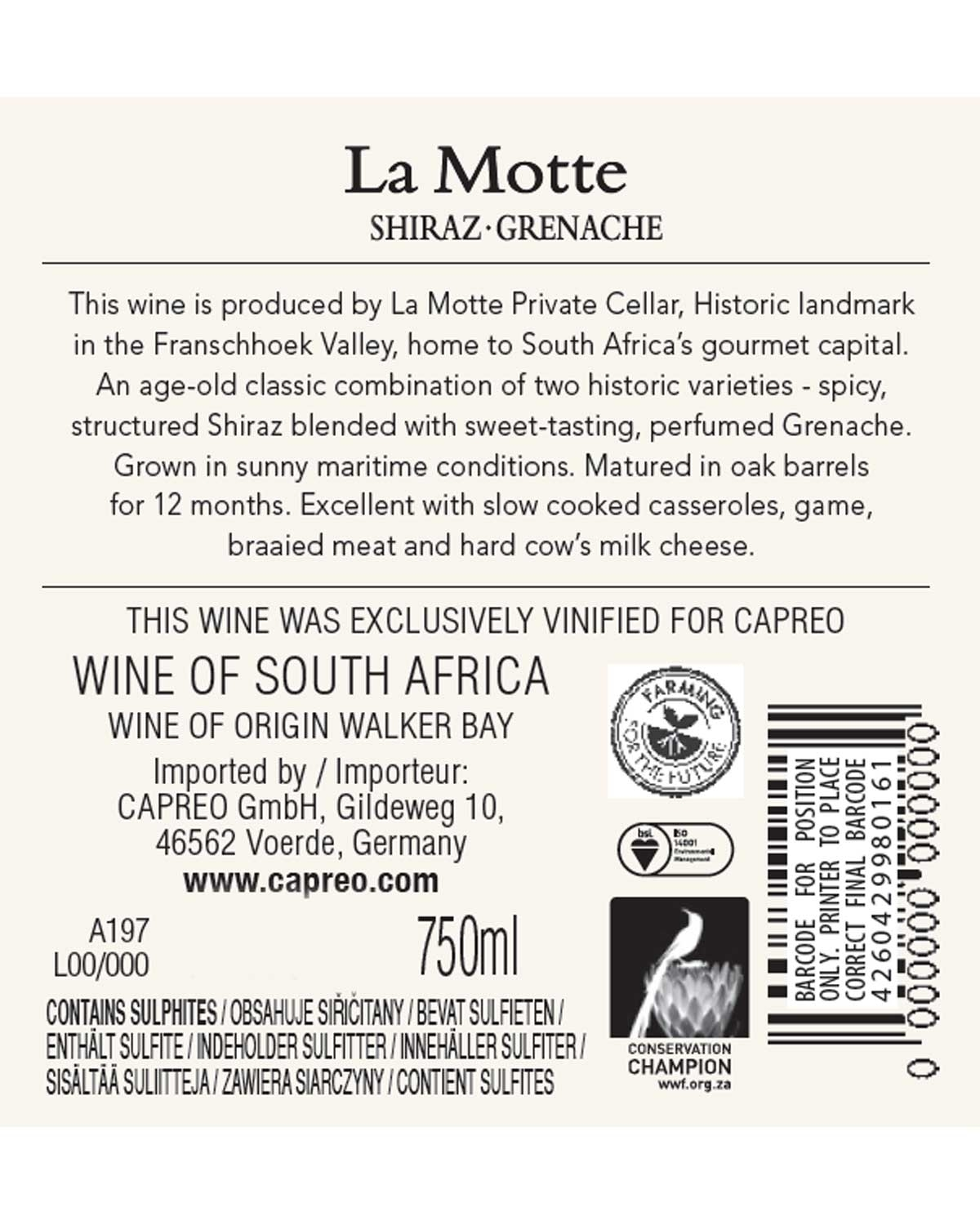 La Motte Cellarmaster Shiraz Grenache ist eine exklusive Kollektion von CAPREO, in Zusammenarbeit mit La Motte.