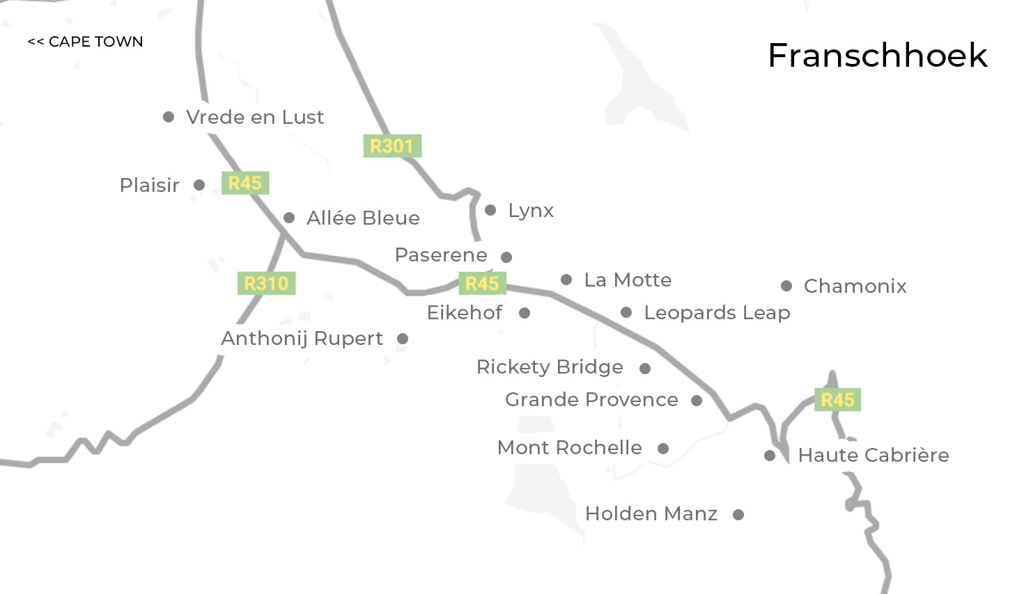 Auf der Franschhoek Wine Route erwarten Genießer über 30 Weingüter – darunter einige der renommiertesten Namen der südafrikanischen Weinindustrie. Viele Weingüter tragen bis heute ihre französischen Namen und vermitteln das Gefühl, als befände man sich in der Provence. Hier treffen kulinarische Genüsse und eine französische Lebensart auf herzliche südafrikanische Gastfreundschaft.