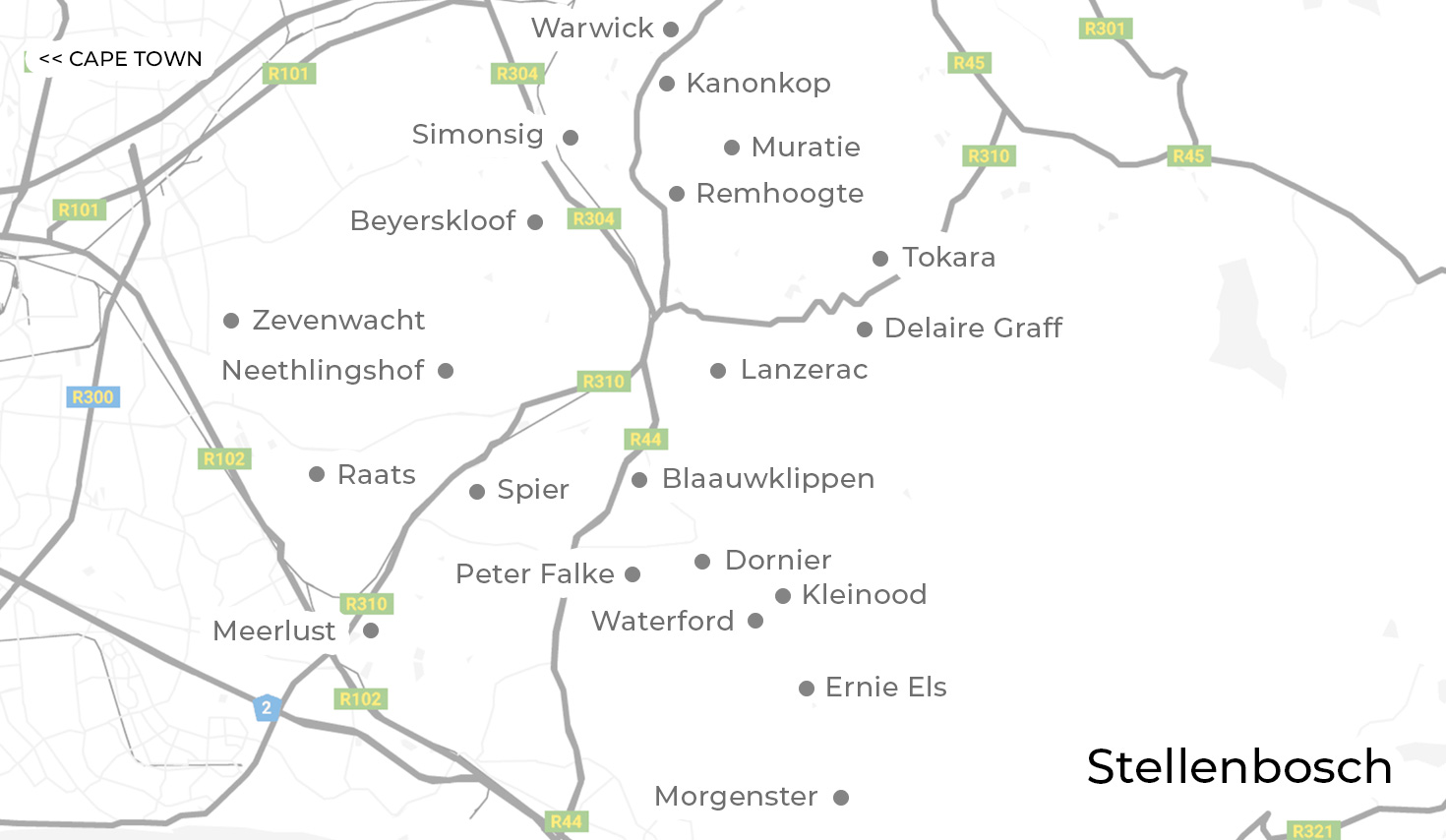 Aufgrund der Ausmaße der Stellenbosch Wine Route teilt sich die Weinroute in vier Teilstraßen – Stellenbosch Berg Wine Estates, Bottelary Hills Wine Estates, Greater Simonsberg Wine Estates und Stellenbosch Valley Wine Estates. Zu den Stellenbosch Berg Wine Estates gehören namhafte Weingüter wie Lanzerac, Kleine Zalze, Blaauwklippen und Dornier, zu den Greater Simonsberg Wine Estates gehören unter anderem Warwick, Kanonkop, Muratie, Simonsig, Tokara sowie Delaire Graff und zu den Stellenbosch Valley Estates zählen Neethlingshof, Zevenwacht, Spier und Meerlust.