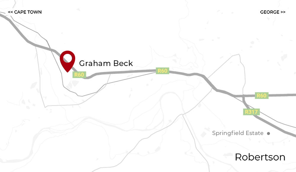 Das Weingut Graham Beck liegt inmitten des wunderschönen Breede River Tals am Rand der halbtrockenen Little Karoo Region. Die beiden Flüsse Breede und Finch unterteilen das Gut, welches seitlich von den Langeberg Mountains flankiert ist. Das Gut liegt auf der berühmten Route 62, einer gewundenen Landstraße, die die Besucher auf eine unvergessliche Tour der zahlreichen Attraktionen der Region mitnimmt. Mit seiner wunderschönen Landschaft und seinen Spitzenweinen lädt Graham Beck zum Probieren, Genießen, Verweilen, Erkunden und immer wieder zum Zurückkehren ein.