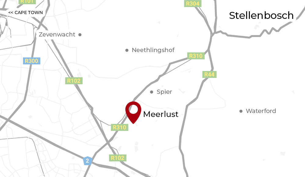 Meerlust liegt fünfzehn Kilometer südlich von Stellenbosch inmitten des berühmtesten Weingebiet Südafrikas. In keiner anderen Region entstehen derart viele Premiumweine auf Top-Niveau. Meerlust bedeutet übersetzt übrigens „Freude der See“, da es nur fünf Kilometer von der imponierenden Bucht am Kap der Guten Hoffnung, der „False Bay“ entfernt ist. Das Terroir ähnelt dem von Bordeaux und besticht durch die Mischung der vielen Bodenarten, die hervorragend geeignet sind, um diesen exklusiven Wein herzustellen. Die langen Sommerabende, aber auch das ein kühle und vom Meer geprägte Klima sind perfekt für den anspruchsvollen Weinanbau geeignet. Abgerundet wird dies durch den regelmäßigen Abendnebel auf Meerlust, der für die nötige Feuchtigkeit sorgt.