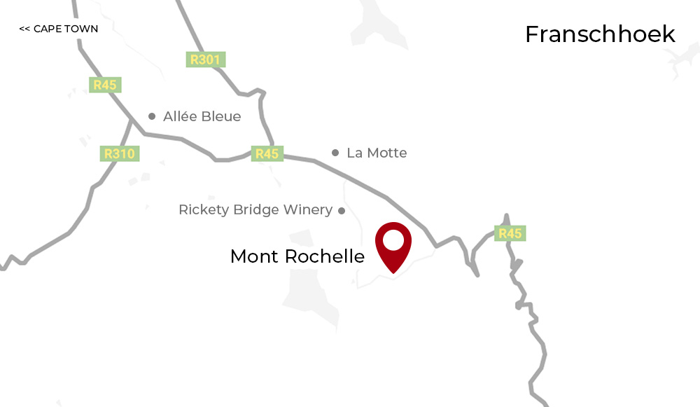 Weine von Mont Rochelle werden in kleinen Produktionsmengen, dafür jedoch mit besonders hoher Qualität hergestellt. Die wunderschönen Weinberge grenzen an das Mont Rochelle Weingut im Franschhoek-Tal und sind hauptsächlich mit den Rebsorten Sauvignon Blanc, Chardonnay, Syrah und Cabernet Sauvignon bepflanzt. Trockene Sommer und regenreiche Winter mit einer kühlen Brise lassen die Trauben besonders gut reifen und bringen fruchtige Weißweine und körperreiche Rotweine hervor. Die beiden edlen Flagship-Weine von Mont Rochelle sind der „Miko Red“ und der „Miko White“. Diese Premiumweine werden nur in den besten Jahren aus hervorragenden Trauben produziert. Miko ist eine Hommage an den ersten dunkelhäutigen Besitzer Miko Rwayitare, der zusammen mit dem damaligen Teilhaber Erwin Schnitzler das Weingut erneut aufbaute, nachdem es durch einen Brand im Jahr 2006 größtenteils zerstört war. Mont Rochelle Weine lassen sich nicht nur beim Picknick oder in den hauseigenen Restaurants genießen, sondern auch im beeindruckenden 150 Jahre alten Weinkeller, der mit seinem Charme die perfekte Atmosphäre für eine erlebnisreiche Weinverkostung versprüht.