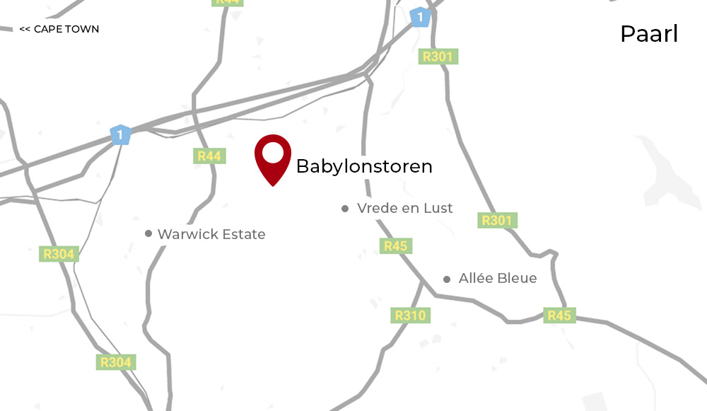 Babylonstoren liegt vor atemberaubender Kulisse des Simonsberg Mountains zwischen Stellenbosch und Paarl. Benannt wurde das historische Weingut nach dem Hügel „Babel“, der direkt neben dem Weingut liegt. Babylonstoren gehört zu den ältesten Weingütern Südafraikas. Bis 1692 reicht die Geschichte des Gutes zurück und viele Details erinnern an die lange Tradition von Babylonstoren. Die kapholländische Architektur der Gebäude wurde zu großen Teilen erhalten und sehr sorgfältig um hochmoderne Akzente ergänzt. Die Weine werden heute in einem State-of-Art Weinkeller produziert – entworfen von Gerard de Villiers, Eigentümer des Weinguts Kleinood und einer der bekanntesten Architekten auf seinem Gebiet!