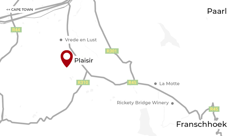 Die Wurzeln des Weingutes Plaisir reichen bis ins Jahr 1693 zurück. Gegründet wurde es von dem Hugenotten Charles Marais, der seine Heimat Frankreich verließ, weil er sich in Südafrika ein besseres Leben für seine Familie erhoffte. Da Charles Marais schon bei seiner Ankunft Ahnung vom Weinbau hatte, war Plaisir auch eines der ersten Weingüter in der Region zwischen Franschhoek und Paarl, das Reben für Wein aus Südafrika anbaute. An den Hängen des Simonsberges in der Nachbarschaft von Vrede en Lust ist auch heute noch das französische Flair spürbar – zum Beispiel im Namen des Weingutes Plaisir: Er erinnert an die französische Heimatstadt Le Plessis Marly, aus der Charles Marais stammte. Daraus entwickelte sich „Plaisir“, das bedeutet „Freude“.