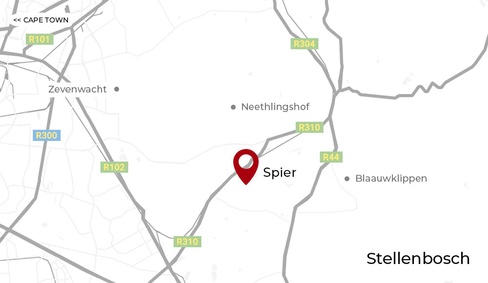 Das Spier Weingut liegt in Südafrikas sogenanntem „Weinherzen" in Stellenbosch. Die ausgezeichneten Böden und der gute Niederschlag in den Wintermonaten sorgen zusammen mit der Expertise und dem Können der Winzer für eine gleichbleibend hohe Qualität bei den Jahrgängen. Knapp 25 Kilometer von Kapstadt entfernt, ist Spier auch ein beliebtes Ausflugsziel.