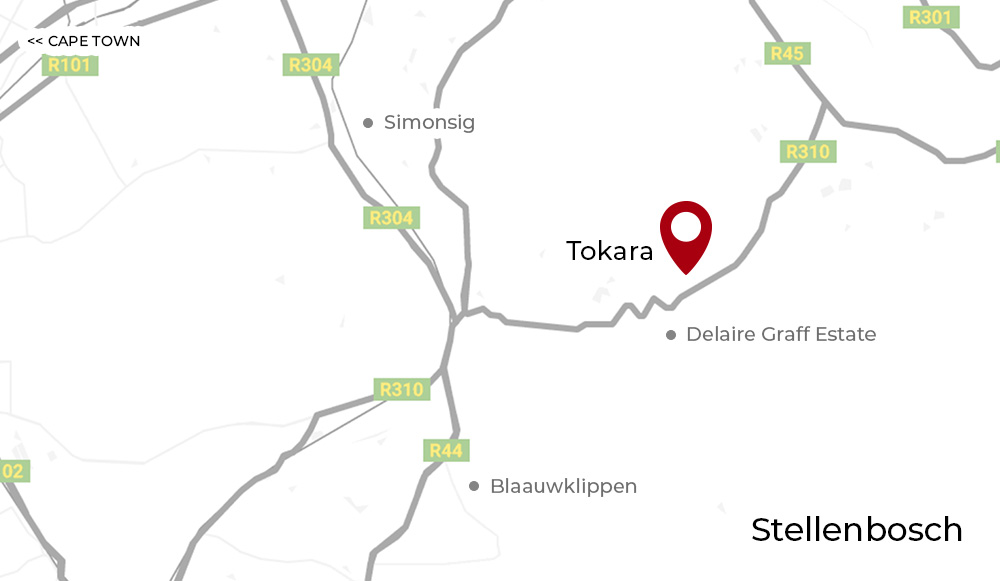 Das Weingut Tokara liegt am Helshoogte Pass, nur wenige Kilometer von der Stadt Stellenbosch entfernt, und befindet sich somit im Zentrum des südafrikanischen Weinanbaus. Die Architektur des Weinguts verbindet dabei die modernen Aspekte des Weinausbaus mit einem gelassenen und unkomplizierten Design. Natürliche und warme Materialien geben den starken und klaren Linien einen organischen Aspekt. Zusätzlich liefert der fast schon magisch anmutende Ausblick auf die False Bay und den Tafelberg eine prächtige Kulisse für die vielen Gäste des Restaurants Tokara Delicatessen. Dieses Lebensgefühl der Gelassenheit, aber dennoch einer großen Energie, findet sich auch im Tokara Wein aus Südafrika wieder.