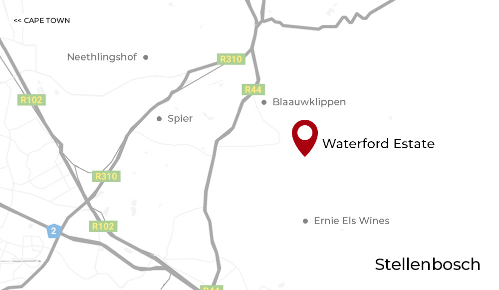 Das Waterford Estate entstand durch eine ganz besondere Partnerschaft zwischen zwei Familien, die den Traum hatten, ein Weingut zu erschaffen, auf dem ein unbeschwertes Lebensgefühl, die Schönheit der Natur und deren Früchte geschätzt und gefeiert werden. Die Familien Ord und Arnold riefen dabei nicht nur ein weiteres Weingut am Kap ins Leben, sondern erschufen ihre eigene, neue Heimat. Und dieses Gefühl spüren auch die Gäste bei Waterford. Das Weingut war ursprünglich ein Teil von Stellenrust und liegt im malerischen Blaauwklippen Valley, in der südafrikanischen Anbauregion Stellenbosch. Neben den Häusern zieren Zitronenbäume und duftende Lavendelfelder das Gut.