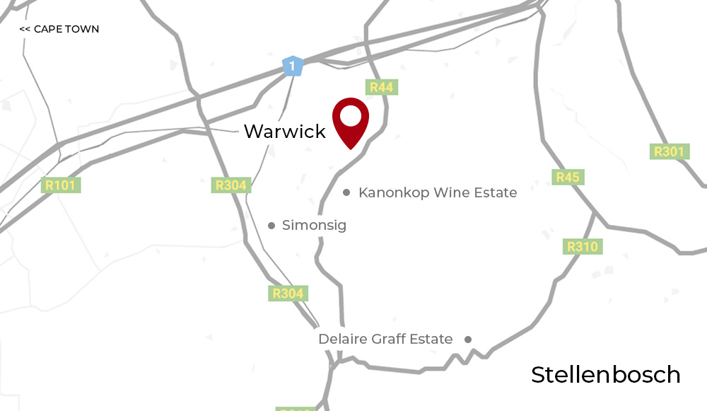 Im Norden von Stellenbosch, an den Hängen des Simonsberges gelegen, kann Warwick Estate auf eine lange Tradition in der Herstellung einiger der besten und renommiertesten Weine Südafrikas zurückblicken. Rote Rebsorten stehen dabei im Fokus, darunter sind ikonische Weine wie der Trilogy, der rebsortenreine Cabernet Franc oder der Cape Blend Three Cape Ladies. Das Weingut produziert darüber hinaus einige viel beachtete Weißweine wie den White Lady oder den Professor Black. Die First Lady-Kollektion erinnert an das Erbe von Norma Ratcliffe – eine der ersten Winzerinnen vom Kap – die Warwick zum Erfolg verholfen hat, seit sie 1984 den ersten Wein des Gutes produzierte.